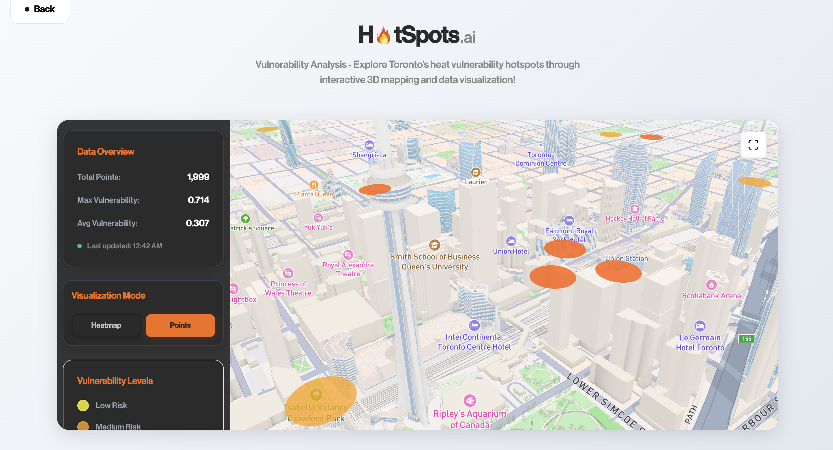 Users can explore tree density, building density, and temperature patterns across Toronto in real-time, with color-coded heat maps that clearly highlight areas requiring intervention. The 3D perspective provides crucial context that traditional 2D maps cannot convey.