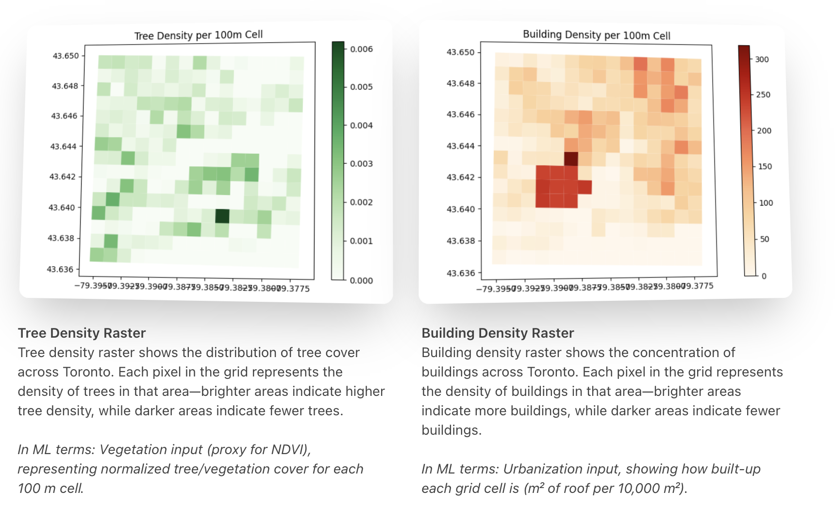 The model uses carefully tuned weights (60% temperature, 20% vegetation, 20% buildings) to generate heat vulnerability scores. We then rasterize both building and tree density into uniform 100m grid cells across Toronto, creating a comprehensive feature matrix that captures the complex spatial relationships affecting urban heat.